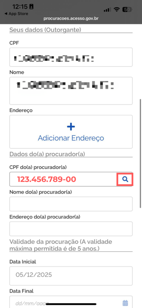 4. Informe o CPF do representante, selecione os serviços autorizados e o prazo de validade;